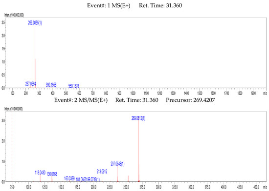 Formononetin had a retention time of 31.205 min. It showed [M+H]+ at m/z 269.0852 (predicated mass: 269.0773; error: 4.49 ppm; element composition: C16H13O4) in the PI mass spectrum and showed [M−H]− at m/z 267.0669 in the NI mass spectrum. Its molecular formula was determined to be C16H12O4. In the MS2 PI mass spectrum, it showed a base peak at m/z 269.0812 [M+H]+ and was accompanied by several distinctive fragment ions, including 5B+–2H, 5A+–2H, 1,3A+–2H, M+–CH3OH, M+–CH3OH–CO, M+–CH4, etc. [29,30,31,32,33]. Based on the MS2 and MS3 spectra, its major fragmentation pathways in the PI mode were proposed and are shown in Figure 2.