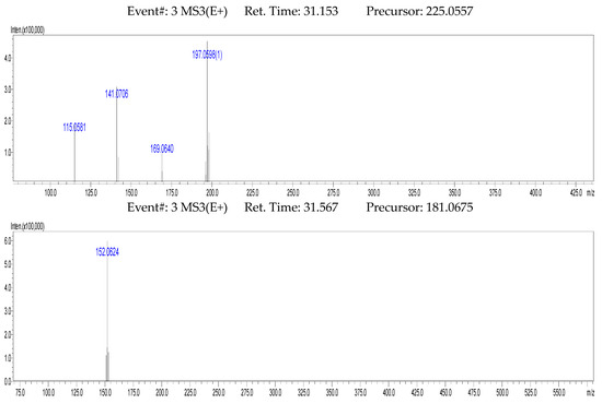 To identify and help elucidate the structures of the metabolites, we first studied the MSn fragmentation behavior of formononetin in the PI (positive ionization) mode and NI (negative ionization) mode. We found that the fragmentation behavior in the PI mode can give more information about the structure than in the NI mode [29,30,31]. We elucidated the structure of the metabolites mostly via a PI mass spectrum, which is shown in Figure 1.