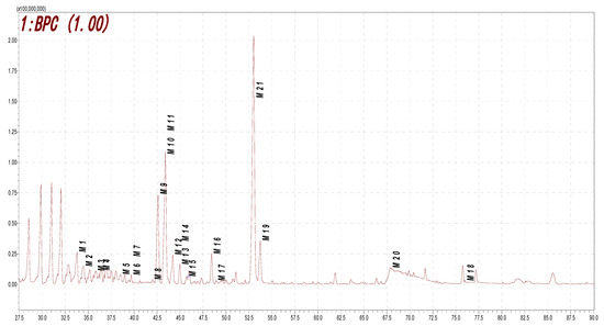 The ESI-IT-TOF-MSn parameters were set as follows: (1) Flow rate: 0.2000 mL/min (split from HPLC effluent). (2) Detected in alternating positive ion (PI) and negative ion (NI) mode. (3) Ion source temperature: 250 °C; curved desolvation line temperature: 250 °C; ESI nebulization gas flow (nitrogen): 1.5 L/min; ESI voltage: 4.5 kV; detector voltage: 1.80 kV; ion accumulation time: 20 ms; relative collision energy: 50%. (4) Mass range: m/z 220–1000 in MS, m/z 50–1000 in MS2 and MS3. (5) A data-dependent program was used in analysis so that the two most abundant ions in each scan were selected and subjected to MS2 and MS3 analyses. (6) All data were acquired and processed using Shimadzu LCMS solution Version 3.36, Formula Predictor Version 1.01, and Accurate Mass Calculator software (Shimadzu Corporation, Guangzhou, China, LCMS solution, version 3). (7) Mass calibration was carried out using a trifluoroacetic acid sodium solution (2.5 mmol/L) from 50 to 1000 Da.