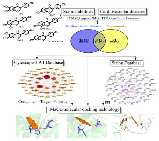 Finally, the researchers conducted a network pharmacological analysis of the main components in similar structures, hoping to provide a reference for the subsequent determination of active structures. Through network pharmacology and macromolecular docking, the relationship between six metabolic components isolated from rat liver S9 after the hatching of formononetin and potential targets of CVD were analyzed, and six metabolites were found to be involved in the main roles of 10 receptors in the treatment of CVD. We compared the binding activity of these metabolites with that of the first two receptors (HSP90AA and SRC) and found the metabolites with the strongest binding abilities to the corresponding receptors. These research results also indicate that a prototype drug may produce a large number of metabolites after administration, and the specific molecular form that plays a therapeutic role may be the prototype or may be metabolites produced by the prototype, which require a specific analysis. In summary, the above research on formononetin and its glycosides (onion) has a certain guiding role for their further applications [22,23].
