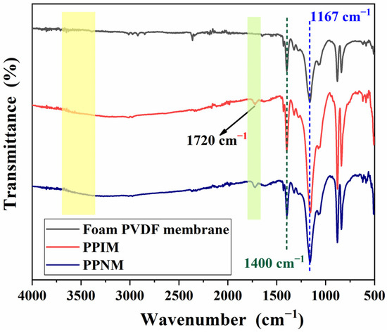 FT–IR spectra of foam PVDF membrane, PPIM and PPNM.
