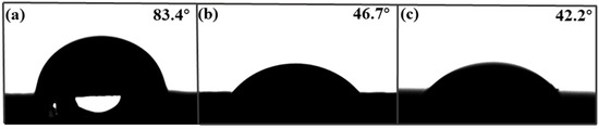 Contact angle (CA) is an important factor affecting adsorption performance. Figure 4 shows the contact angle images of the foam PVDF membrane, PPIM, and PPNM. We can see that the contact angles of the foam PVDF membrane was 83.4°. As we know, pure PVDF powder should be hydrophobic, but there were rich pores in the surface and interior of the foam PVDF membrane. Thus, the contact angle of the foam PVDF membrane was less than 90° due to the water droplets penetrating directly through the pores in the membrane. The corresponding contact angles of the PPIM and PPNM were 46.7° and 42.2°, indicating that the hydrophilicity increased after the PDA/MIP modification. This was due to there being many polar groups of hydroxyl groups and amino groups in the introduction of PDA in the PPIM and PPNM.