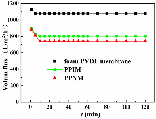 Flux is an important condition that affects membrane separation capability. Considering that the subsequent adsorption experiments were all carried out in an ethanol solution, here, the ethanol flux of the foam PVDF membrane, PPIM, and PPNM were tested under a pressure of 10 Kpa. As shown in Figure 5, the fluxes of the foam PVDF membrane, PPIM, and PPNM were large at the initial moment, about 1122.61 L/m2/h, 897.13 L/m2/h, and 883.24 L/m2/h, respectively. After that, the flux decreased over time and basically reached a stable level in about 10 min. In addition, compared with foam PVDF membrane, the fluxes of PPIM and PPNM were significantly reduced. This was possibly ascribed to the MIPs and NIPs introduced by PDA occupying the holes of the membrane, which hindered the passage of ethanol to a certain extent. Nevertheless, PPIM and PPNM still kept larger fluxes with 801.59 L/m2/h and 789.93 L/m2/h, respectively, which indicated that the PPIM and PPNM can achieve good separation requirements for a long time in practical applications.