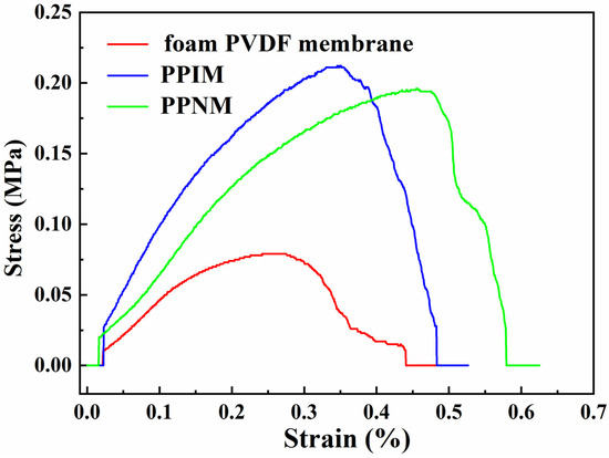 Mechanical strength is one of the important effects of the membrane in practical applications. Therefore, we measured the stress–strain curve to quantitatively study the mechanical properties of the membranes. Figure 6 shows the tensile stress curves of the PPIM, PPNM, and foam PVDF membrane. It can be seen the tensile stress and elongation at break of the foam PVDF membrane were relatively low, being 0.077 MPa and 0.44%, respectively. In contrast, the mechanical properties of the PPIM and PPNM prepared in this experiment were significantly improved, with the tensile stress and elongation at break increasing more than twice, to 0.20 MPa and 0.48%, respectively. The corresponding tensile stress and elongation at break for the PPNM is about 0.19 MPa and 0.57%. It was obvious that the tensile properties of the PPIM and PPNM were better than those of the foam PVDF membrane, which was mainly due to the introduction of PDA in the membrane, improving its mechanical strength.