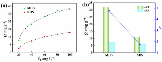 In order to verify the imprinting effects of the PPIM resulting from molecularly imprinted polymers, we investigated the binding isotherm and competitive binding of pre-synthesized MIP microspheres with ART and ARE. As depicted in Figure 8, the static equilibrium binding capacity of ART to MIPs initially increased rapidly as the initial ART concentration rose, and then reached a plateau. In contrast, the adsorption capacity of ART onto NIPs gradually increased with higher initial concentrations. It is evident that MIPs exhibited a substantially greater adsorption capacity for ART compared to NIPs, suggesting that MIPs possessed a larger number of specific binding sites for ART, enhancing the adsorption capacity. Furthermore, competitive adsorption experiments were conducted for coexisting compounds (ART and ARE) on both MIPs and NIPs at a concentration of 80 mg L−1. The αART/ARE value of MIPs for ART relative to ARE is 4.75, significantly exceeding that of NIPs, indicating that MIPs have a notably higher recognition ability for ART than NIPs.