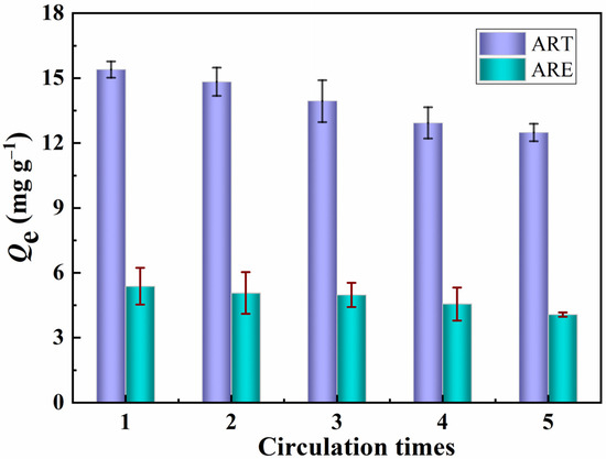 The dynamic crossflow selective separation membrane was directly used in regeneration experiments to evaluate the stability and practicability of the PPIM. The adsorbed PPIM was eluted with CH3OH/HAc (v/v, 9:1) solution, and the adsorbed template molecule ART was removed and then used again for selective separation experiments. This operation was repeated five times. Figure 10 shows the adsorption capacity of the PPIM for ART and ARE. It can be seen from Figure 12 that the prepared membrane still maintains a relatively high adsorption and separation capacity (17% lower than the initial binding capacity) after being recycled five times, showing that the PPIM has relatively good regeneration performance.