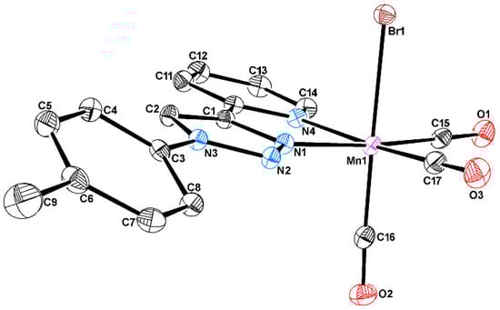 Crystals suitable for single-crystal X-ray analysis of compound 3 were selected and covered with Fomblin (polyfluoro ether oil) and mounted on a nylon loop. The data were collected at room temperature via a Bruker D8 Venture diffractometer equipped with a Photon 100 CMOS detector using graphite monochromated Mo-Kα radiation (λ = 0.71073 Å). The data were processed using the APEX3 suite software package, which includes integration and scaling (SAINT), absorption corrections [45] (SADABS), and space-group determination (XPREP). The structure solution and refinement were performed using direct methods using the programs SHELXT 2014/5 and SHELXL (version 2018/3) [46,47] via inbuilt APEX and WinGX-Version 2020.1 [48] software packages. All non-hydrogen atoms were anisotropically refined. All hydrogen atoms were inserted in idealised positions and allowed to refine riding on the parent carbon or oxygen atom with C–H distances of 0.93 Å and 0.96 Å for aromatic and methyl H atoms, respectively. The molecular diagrams were drawn using ORTEP3 (version 2020.1) [48] in the software package. Crystal data for 3 were as follows: C17H12BrMnN4O3, FW = 455.16, monoclinic, space group P21/c (no. 14), Dc = 1.735 g cm−3, Z = 4, a = 19.3095(10), b = 13.5001(7), c = 6.6858(3) Å, α = 90, β = 90.145(2), γ = 90 °, V = 1742.85(15) Å3, T = 110(2) K. For a Bruker Venture diffractometer with a Photon 100 area detector, λ (MoKα) = 0.71073 Å and µ = 3.075 mm−1. Of the 40,065 reflections measured, 6684 were unique. Refinement on F2 concluded with the values R1 = 0.0361 and wR2 = 0.0817 for 235 parameters and 5394 data with I > 2σI. The data were deposited in CCDC under the deposit number 2298511.