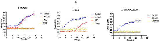 The effects of MIC and sub-MICs of 4 on the growth of the bacteria were monitored in rich media, namely MH broth, in the presence of the MIC and sub-MICs (½ MIC, ¼ MIC, and 1/8 MIC) of the complexes. The monitoring of the bacterial growth was performed for 24 h by incubating 96-well plates using a R. Biolog’s OmniLog® PM Sytem automated platform. Untreated controls were prepared in parallel and under growth monitored under the same conditions for each of the strains. At ½ MIC, there was an extension of the lag phase on all the bacteria tested. In the case of the Gram-negative bacteria after the extension of the lag phase, the bacteria were able to grow but never reached the same level as the control. The opposite was obtained with S. aureus, which, after the extension of the lag phase, was able to reach the same level of growth as that of the control (no compounds). This extension of the bacterial lag phase was not unexpected, since it is known that bacteria require time to adapt to the presence of toxic compounds. Some examples are given in Figure 3 regarding the growth of S. aureus, E. coli, and Salmonella in the presence of 4.