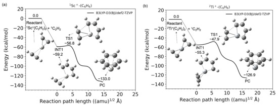 Figure 1a,b shows the potential energy profiles (obtained from the B3LYP-D3(BJ)/def2-TZVP calculations) of the acetylene cyclotrimerization reactions for the conversion of the reactant (C2H2 + (C2H2)2-TM+) to the product complex (PC) (C6H6-TM+) catalyzed by the TM+ (TM = Sc and Ti) complexes. The horizontal axis represents the reaction path length measured within the mass-weighted coordinate system, and the origin of the corresponding axis is taken to be the first intermediate complex, which is primarily produced by the association of the (C2H2)2-TM+ reactant with an additional C2H2 molecule. Zero energy is defined as the energy level of the C2H2 + (C2H2)2TM+ reactants, and no zero-point energy correction was included (the harmonic zero-point energy values for all stationary points found in this study are reported in the Supplementary Materials). Figure 1a,b clearly shows that both reactions from the reactants to PCs are totally exothermic. Further details such as the molecular structures at the stationary points and the reaction and the reaction paths are discussed later. The potential energies at each stationary point from the reactants to products (benzene + TM+) via the intermediate (INT1) and transition (TS1) states and their vertical excitation energies are shown in Table 1. The spin state i of the reactants corresponds to the superscript of i{1C2H2, iSc+(C2H2) (i = 1, 3, and 5)} and i{1C2H2, iTi+(C2H2) (i2, 4, and 6)}. The spin states of the products are represented as i{1benzene, iSc+(C2H2) (i1, 3, and 5)} and i{1benzene, iTi+ (i = 2, 4, and 6)}, respectively. From the reactants to PCs, the potential energies of the lowest spin state were found to be consistently lower than that of the higher spin state. For example, in the case of Sc+, the spin state of the electronic ground state of the isolated Sc+ cation is known to be a triplet; however, the spin states of the (C2H2)3Sc+ in the electronic ground state are singlets. Similarly for Ti+, the potential energy surface of the doublet was lower than that of the quartet and sextet. The Sc- and Ti-catalyzed product fragments have triplet and quartet electronic ground states, as expected. The highest spin states for both systems do not seem to contribute to the cyclotrimerization because their potential energies through the overall reaction pathway relatively represent large values. The quintet and sextet energies of the products are extremely high because the electron configuration of isolated Sc+ is [Ar]3d14s1 and that of Ti+ is [Ar]3d24s1, and excitation from the inner shell is required. Herein, an affordable pathway to obtain the final product fragments should be emphasized. Under low-density conditions, the intramolecular redistribution of vibrational energies derived from the exothermic energy could play an important role in releasing the transition metal cation. Furthermore, one of the most reasonable pathways to obtain the final product fragments is the dissociative electron attachment: (benzene-TM+) + e− → benzene + TM [46,47]. For example, the reaction involving a spin transition, (1benzene-1Ti) → 1benzene + 3Ti, is only a 0.5 kcal/mol endothermic reaction (see Table S1). The vibrational continuum and resonance states of the neutral product complex involved in the electron attachment provide relatively large vibrational energies to the complex. The metal–molecule complex therefore enables the dissociation to the benzene and neutral metal fragments. Alternative pathways are photodissociation by irradiation of the cosmic rays and collisional dissociation by encountering other systems in the dense clouds [46,47].