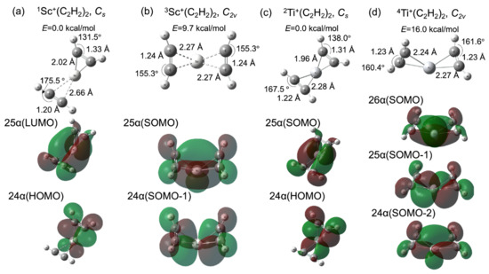 Optimized geometries (upper panel) and molecular orbitals (lower panel) contributed to π-back-donation for Sc+(C2H2)2 of (a) singlet and (b) triplet states, (b) Ti+(C2H2)2 of (c) doublet and (d) quartet (red). The potential energies for the reactants are set as 0 kcal/mol.