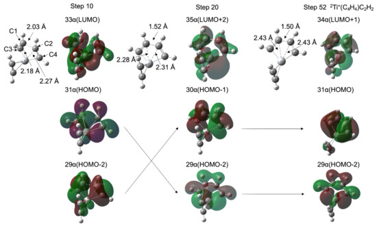 As shown in Figure 1a,b, the TM+C4H4 five-membered metallacycle structures (INT1) were formed without potential barriers, which was confirmed through the geometry optimization (See Figure S2 in the Supplementary Materials). It was predicted that the occupied d-donor orbitals were insufficient to maintain the forms of the three acetylenes for the 1Sc+- and 2Ti+-catalyst systems. Figure 3 shows molecular structures at optimization steps 10, 20, and 52 for the 2Ti+-catalyst system (See Figure S2b) and the crucial molecular orbitals. In 31 α (HOMO) at step 10, one d-donor orbital is shared with C1-C3 π* and C2-C4 π* orbitals of each acetylene, where the C1-C2 length is 2.03 Å. The 29 α (HOMO-2) at step 10 is due to the π-donation to the unoccupied metal d-orbital from the occupied C1-C3 π and C2-C4 π orbitals. The Ti-C1 and Ti-C2 coordination interactions are correlated with 33 α (LUMO). During the optimization process to step 20, the C1-C2 bond (1.52 Å) was generated with the C1-C2 σ-orbital in 29 α (HOMO-2). This MO was stabilized (31 α → 29 α) and the MO included a node between C1 and C2 was destabilized (29 α → 30 α) from steps 10 to 20. The Ti-C1 (Ti-C2) bond was elongated from 2.18 (2.27) Å to 2.28 (2.31) Å with the 35 α (LUMO+2) which does not interact between the 3d and C1-C3 (C2-C4) π orbitals. Eventually, a five-membered metallacycle intermediate of the doublet Ti+(C4H4)C2H2 was generated in step 52. This metallacycle formation from the reactants is similar to the titanium metallacyclobutane formation from an ethylene and titanium methylidene, which is the barrierless reaction [54]. The π-back-donation does not contribute to the reaction. As mentioned above, the coordination conformations between the metal and unsaturated hydrocarbon are critically influenced by the π-back-donation based on the spin-uncoupling mechanism. In the cases of the 2Ti+-catalyst as well as 1Sc+-catalyst systems, the d-donor electrons contributing to the π-back-donation are not enough to keep three acetylenes separately. It is suggested that a small number of occupied d-donor orbitals induce the barrierless formation of the five-membered metallacycle.