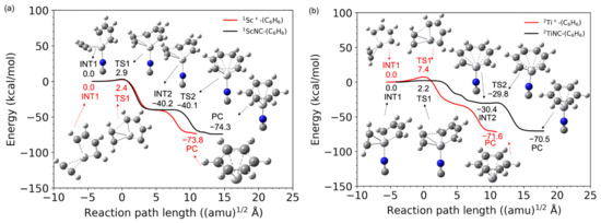 Relative energies as a function of the reaction path length for (a) scandium and (b) titanium compounds. The red and black lines represent the potential energies for the bare TM+ catalyst and TMNC catalyst systems, respectively (TM = Sc and Ti). Zero energy is defined as the energy level of each intermediate complex, INT1.