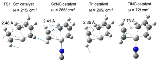 Imaginary frequencies, their vibrational vectors, and important CC distances at TS1 with their structures for Sc+, ScNC, Ti+, and TiNC catalyst systems.