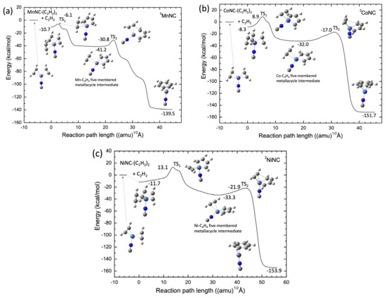 Potential energy profiles for the acetylene cyclotrimerization reactions catalyzed by (a) Sc+NC− (singlet spin) and (b) Ti+NC− (doublet spin) compounds as a function of the reaction path length obtained at the B3LYP-D3(BJ)/def2-TZVP DFT-D3 level. Zero energy is defined as the energy level of the C2H2 + TM+NC−-(C2H2)2 reactants (TM = Sc and Ti).