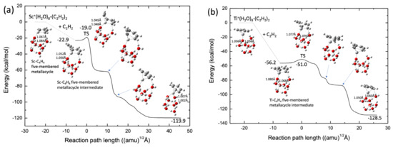 Potential energy profiles for the acetylene cyclotrimerization reactions catalyzed by (a) Sc+ (singlet spin) and (b) Ti+ (doublet spin) compounds as a function of the reaction path length obtained at the B3LYP-D3(BJ)/def2-TZVP DFT-D3 level. The zero energy is defined as the energy level of the C2H2 + TM+-(C2H2)2 reactants (TM = Sc and Ti).