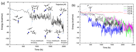 Figure 9a shows a typical BOMD trajectory (trajectory #1) for the TiNC complex, where the potential energy is plotted as a function of the simulation time, along with a few selected structures. In the early stage of this trajectory (t < 600 fs), the third acetylene molecule approaches the Ti+ moiety in the complex because of attractive forces, as previously mentioned. At t ≈ 700 fs, the two carbon atoms in the two acetylenes approach each other, forming a CC bond, thereby generating a five-membered metallacycle intermediate with a C2H2-TiNC-C4H4 structure. This intermediate structure was maintained up to t = 1500 fs. At t ≈ 1500 fs, a new CC bond is formed between C2H2 and the C4H4 moiety, producing a seven-membered metallacycle intermediate with a TiNC-C6H6 structure. The lifetime of this intermediate is not long (~300 fs), and the benzene structure is readily formed at t ≈ 1900 fs in this trajectory. These real-time nuclear dynamic behaviors are qualitatively consistent with the potential energy profile of the reaction path presented in Figure 4b. The results for the other four BOMD trajectories are shown in Figure 9b. In trajectories of the #2–#5 cases, benzene was finally formed within a simulation time of 2.5 ps, although the lifetime of the intermediate complex differed slightly depending on the nature of the BOMD trajectories. We calculated another trajectory (Trajectory #6 in Figure 9b) in which the third acetylene molecule was initially placed on the other side of the Ti moiety of the TiNC–(C2H2)2 complex (see the inset structure in Figure 9b). Interestingly, the third acetylene molecule does not approach Ti+ because of the presence of the other two C2H2 molecules. In this case, the trajectory consistently bounced dynamically between the third acetylene and the two acetylenes bound to Ti+ during the simulation. This suggests that the initial position of the third acetylene molecule plays an important role in the dynamics of benzene formation. Figure S4 shows the initial configuration of the TiNC–(C2H2)2 complex with the isolated acetylene for all trajectories. At t0 fs, the acetylene was located below the CCCC plane of the two acetylene molecules bound to Ti+ and there was no obstacle between the isolated acetylene and Ti+ in Trajectories #1–#5. As mentioned above, the bond formation between Ti+ and acetylene in Trajectory #6 was prevented by the two acetylenes. The benzene formation movie is presented as Video S1 in the Supplementary Materials.