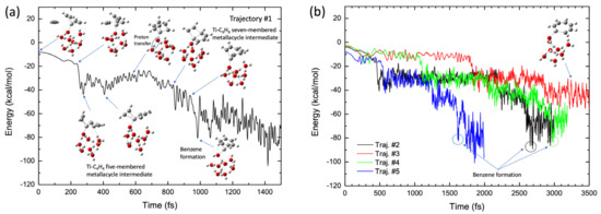 (a) Potential energy profile of the benzene formation trajectory for the (C2H2)3-Ti+(H2O)8 system plotted as a function of simulation time. (b) Potential energy profiles of four trajectories, where one trajectory shows benzene formation while three trajectories show the five-membered metallacycle intermediate formation.
