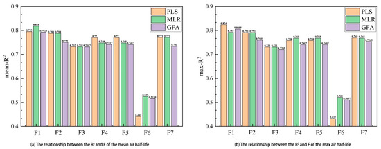 In the process of developing QSAR models, selecting suitable molecular descriptors can provide information about the molecular structure and properties and enhance the accuracy and stability of the model predictions. To determine the optimal combination of descriptors, we employed stepwise regression analysis to construct QSAR models for POPs with mean and maximum half-lives in air and performed analyses under different threshold conditions. Figure 1 illustrates the relationship between the model coefficient R2 and different threshold values F for three regression methods. It can be observed that when the threshold value F is between 0.05 and 0.15, the R2 values for all three regression methods reach their maximum. Specifically, PLS has an R2 value of 0.793. MLR has an R2 value of 0.818, and GFA has an R2 value of 0.792. In addition, five descriptors were identified as most closely related to the air mean and maximum half-life of POPs. Table 1 presents the selected molecular descriptors for different threshold conditions.