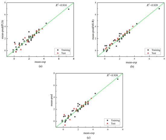 Plot of experimental and predicted values for mean air half-life modeled by PLS (a), MLR (b), and GFA (c).