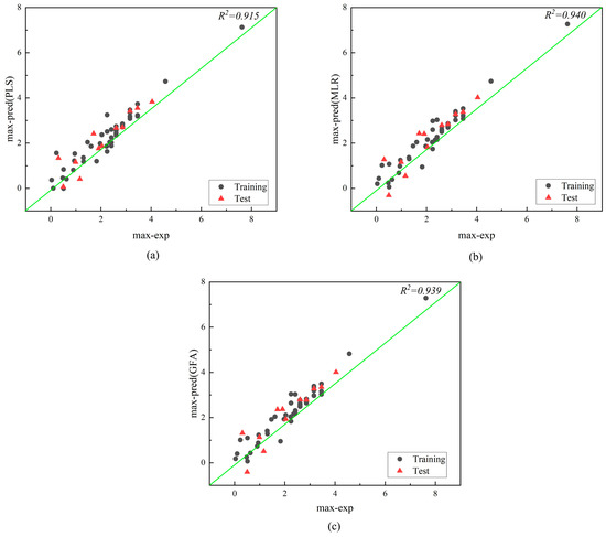 Plot of experimental and predicted values for maximum air half-life modeled by PLS (a), MLR (b), and GFA (c).