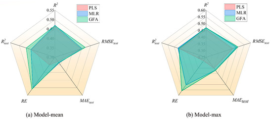 We employed PLS, MLR, and GFA to establish quantitative relationship models between molecular descriptors and air half-lives. The distributions of experimental and predicted values for mean and maximum half-lives are shown in Figure 3 and Figure 4. All data points are scattered around the best-fit line, indicating the consistency between the predicted and experimental values of the constructed models and further confirming the acceptability of the models [22]. To visually represent the parameters of each model, we appropriately normalized the data and provided the metrics R2, R2text, RE, MAEtest, and RMSEtest for three regression models (Figure 5). The fitting effects, hyperparameters (Table 2), and statistical parameters (Table 3) of the three regression models are shown below: