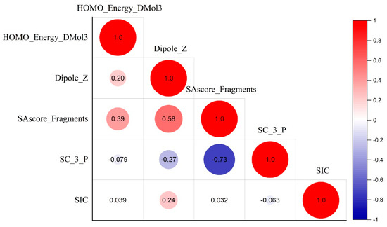 First, simplified molecular input line entry system (SMILES) structures for 60 POPs were retrieved from PubChem (https://pubchem.ncbi.nlm.nih.gov (accessed on 23 November 2022)) [31]. Second, the chemical structures of 60 POPs were built with Maestro and processed with Ligprep in Schrödinger. Discovery Studio (DS) 3.5. software was then used to calculate approximately 586 molecular descriptors. These descriptors included about 10 2D, 3D, structural, thermodynamic, topological, and spatial descriptors [32]. Finally, the construction of the QSAR model was continued using the PLS, MLR, and GFA regression methods built into the commercial DS 3.5 molecular simulation software. For descriptors, we removed constant terms or descriptors that were close to constant and processed descriptors with missing values and outliers. To reduce redundancy in the descriptor data matrix [33], we used the stepwise multiple regression method to eliminate some collinear descriptors. The selected molecular descriptors should meet the inclusion threshold of F = 0.05 and exclude the threshold of F = 0.15. Additionally, the variance inflation factor (VIF) should be less than 10, and the significance level (p) should be less than 0.001. Finally, a Pearson correlation analysis was conducted by using Origin 2020 software. Following the specified requirements, five optimal descriptors were obtained. There is a good correlation between these parameters and the half-life of POPs [34]. The meanings of each descriptor are shown in Table 5. The correlation analysis among the five descriptors is illustrated in Figure 7, and the descriptor correlation matrix is presented in Table S2.