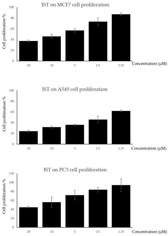 The effect of IST on cancer cell proliferation. MCF7, A549, and PC3 cell lines were treated with IST at the indicated concentrations for 72 h. A MTT test was performed to determine the cytotoxic effect of IST. For each panel, the group of cells that were not administered to IST was considered to exhibit 100% proliferation. Each condition was studied in 5 replicates. Mean ± std.
