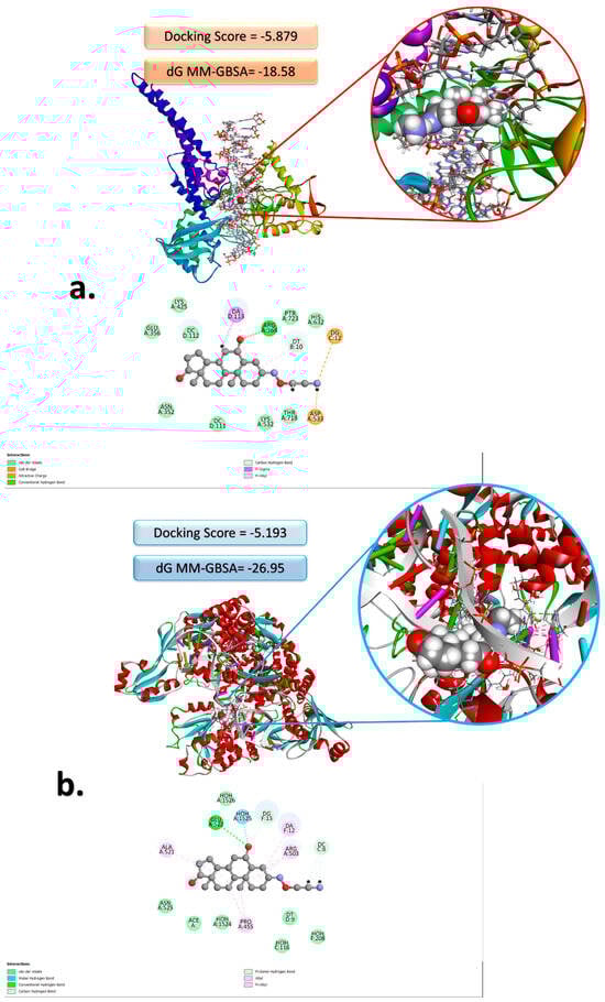 Corresponding 3D and 2D docking poses have the best docking scores for the interaction of the Istaroxime drug with (a) Topoisomerase I and (b) Topoisomerase II proteins.