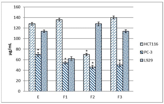 Anticancer properties of the ethanol extract from blackcurrant leaves and its subfractions expressed as IC50 (μg/mL). The values are expressed as the mean ± SD (n = 3). According to the one-way ANOVA LSD test, means with a p-value lower than 0.05 were considered statistically different. Values marked by * mean cytotoxic activity. E—ethanol extract; F1—water fraction, F2—40% methanol/water fraction; and F3—70% methanol/water fraction.