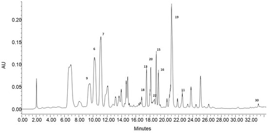 Therefore, the HPLC-DAD analysis was carried out to determine the quantitative differences between the obtained fractions. The study was conducted on 12 compounds identified in the ethanol extract and having available standards. The chromatogram of the ethanol extract indicating compounds analyzed quantitatively is shown in Figure 2.