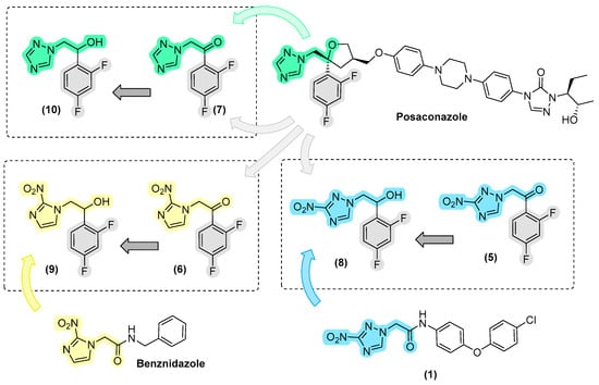 In this sense, compounds containing the 3-nitro-1,2,4-triazole heterocycle were developed and evaluated in vitro and in vivo against T. cruzi, showing high potency and significant selectivity indices with compound 1 (Figure 1) being a representative of this series [11,12]. Molecular modeling studies have shown that these compounds may bind to the catalytic site of the CYP51 enzyme in a similar way to ergosterol biosynthesis inhibitors, such as posaconazole. In addition, enzymatic assays have shown that these substances are significantly converted by the TcNTR enzyme. Thus, it is possible that the 3-nitro-1,2,4-triazole compounds can function through a dual mechanism, acting as substrates of NTR enzymes or as inhibitors of CYP51 [11]. When binding assays were performed with 3-nitrotriazole derivatives and T. cruzi CYP51 enzyme, it was observed that this target was inhibited, thus validating this approach [12].