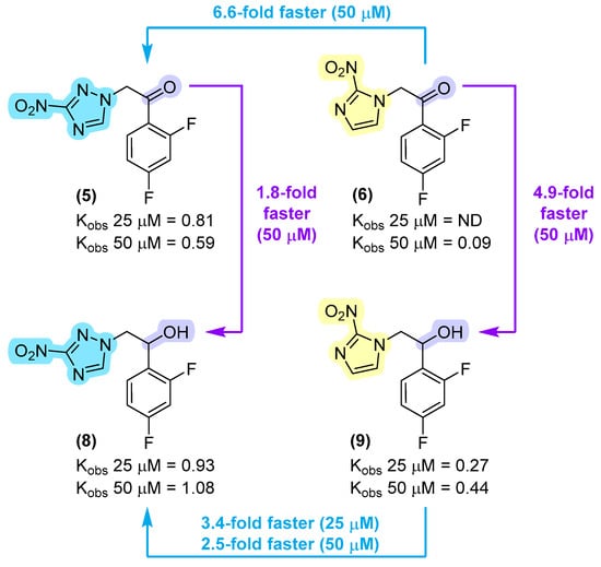 Among the 2-nitroimidazole compounds, only 9 was metabolized at a concentration of 50 µM and at a higher rate than BZN. The nitrotriazole and nitroimidazole derivatives were compared with each other, and it was observed that the nitrotriazole derivatives were consumed at much higher speeds than the nitroimidazole at both concentrations. At a concentration of 25 µM, derivative 8 was consumed at a rate 3.4 times higher than that of derivative 9. At a concentration of 50 µM, derivative 5 was consumed at a rate 6.6 times higher than its nitroimidazole analog 6; derivative 8 showed a consumption rate approximately 2.5 times higher than its corresponding nitroimidazole 9. In addition, at a concentration of 50 µM, the hydroxy derivatives exhibited a higher consumption rate than that of their ketone counterparts, regardless of the heterocycle present. In particular, nitroimidazole derivative 9 was consumed 4.9 times faster than 6, and nitrotriazole derivative 8 exhibited a higher rate of consumption (1.8 times higher than that of 5) (Figure 3).