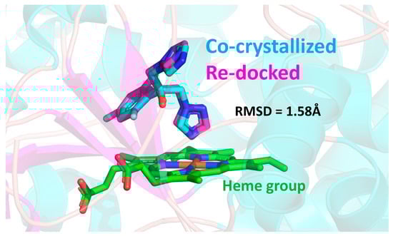Superposition of the cocrystal fluconazole (TPF) and redocked pose. Three-dimensional (3D) representation of the TPF in the binding site of the 14α-demethylase structure (CYP51). The cyan color represents the cocrystal TPF pose (carbon atoms), and the redocked pose of TPF (carbon atoms) is preserved in magenta. Carbons of the heme group are represented in green. The other atoms were colored according to PyMOL defaults (v2.5.0, https://pymol.org, accessed on 18 April 2023) [43]. The root mean square deviation (RMSD) value between the TPF crystal coordinates and predicted coordinates is also shown.