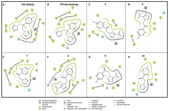 Two-dimensional (2D) diagrams of protein–ligand interactions in the active sites of the 14α-demethylase structure (CYP51) (PDBid.: 2WUZ) [41] using the Maestro (Schrödinger) program [44]. The interactions of cocrystallized (A) and docked (B) poses of fluconazole (TPF) with CYP51 residues and heme groups. 2D docking interactions of Compounds 5–10 poses (C–H) with 14α-demethylase residues and heme groups. Protein–ligand interactions are represented with arrows/lines between ligand atoms and protein residues: H-bonds are represented by solid pink arrows; π–π stacking interactions are shown in green lines; π–cation interactions are represented by red lines; metal coordination is shown in purple line; the salt bridge is represented in red-to-blue gradient lines. The colors in residue circles indicate the residue type: (acidic, red; basic, purple; hydrophobic, green; polar, blue; glycines, light green; metal atoms, dark gray; other, light gray). Ligand atoms that are exposed to solvent are marked with gray spheres. The protein “pocket” is displayed with a line around the ligand, colored with the color of the nearest protein residue.