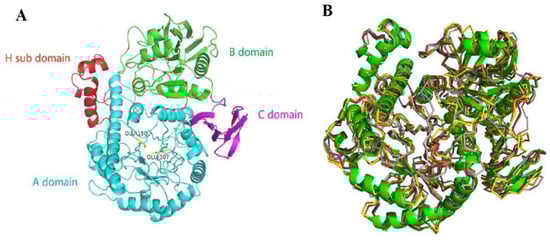 The three-dimensional structure of the PpBGal42A monomer. (A) Ribbon diagram showing the 3D structure of PpBGal42A. The A, B, and C domains are shown in blue (with the H subdomain in red), green, and purple. Catalytic residues Glu150 and Glu307 are labeled and shown as yellow sticks. (B) Structural superposition of PpBGal42A (green) with a β-Gal (PDB:3TTS, red) [23], R-β-Gal (PDB:5E9A, orange) [24], Gan42B (PDB:4OIF, yellow) [25], and BlGal42A (PDB:4UNI, gray) [26]. The figure was prepared using Pymol software 2.5.2.