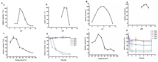 Effect of pH and temperature on activity and stability of PpBGal42A. (A) Using pNPG as substrate. (A-a) Optimal pH. (A-b) pH stability. (A-c) Optimal temperature. (A-d) Temperature stability. (B) Using pNPαArap as substrate. (B-a) Optimal pH. (B-b) pH stability. (B-c) Optimal temperature. (B-d) Temperature stability. Relative activity was calculated using the maximum activity as 100%. Results are presented as the mean ± standard deviation (n = 3).