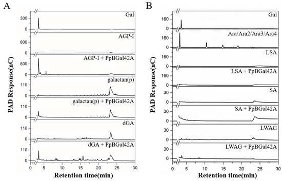 Different polysaccharides (AGP-I (β-1,3-galactan), potato galactan (β-1,4-galactan), dGA (β-1,6-galactan), larch wood arabinogalactian (LWAG), arabinosaccharides (SA), and linear arabinosaccharides (LSA)) were used to evaluate the hydrolytic activities of PpBGal42A. After 24 h of reaction at 30 °C, samples were tested for molecular weight changes using TSK-G3000. The released products were detected by HPAEC using a CarboPac PA-200 column (3 × 250 mm) attached to a Dionex ICS-5000 Plus ion chromatographic system, using the protocol: 0–10 min, 50 mM NaOH; 10–30 min linear gradient of 0–100 mM NaAc in 5 mM NaOH; 30–40 min, 500 mM NaAc in 200 mM NaOH [44].