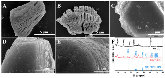 SEM images of Ti3C2Tx (A), TiO2@Ti3C2Tx (B), NIP/TiO2@Ti3C2Tx/GCE (C), and MIP/TiO2@Ti3C2Tx/GCE before (D) and after (E) treatment with elution. (F) XRD profiles of Ti3C2Tx (black) and TiO2@Ti3C2Tx (red).