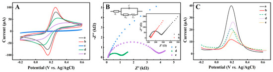 CV curves (A) and EIS (B) of bare GCE (curve a), TiO2@Ti3C2Tx/GCE (curve b), MIP/TiO2@Ti3C2Tx/GCE (before removal, curve c), MIP/TiO2@Ti3C2Tx/GCE (after removal, curve d), and MIP/TiO2@Ti3C2Tx/GCE (after rebinding, curve e) in 0.1 M KCl solutions containing 5 mM [Fe(CN)6]3−/4−. (C) DPV response of MIP/TiO2@Ti3C2Tx/GCE (after removal, curve a), MIP/TiO2@Ti3C2Tx/GCE (after rebinding, curve b), NIP/TiO2@Ti3C2Tx/GCE (curve c), MIP/GCE (after removal, curve d), and MIP/GCE (after rebinding, curve e) in 0.1 M KCl solutions containing 5 mM [Fe(CN)6]3−/4−.