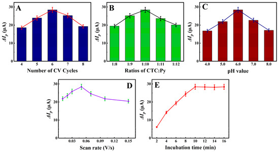 Optimization studies. (A) Cycle numbers of polymerization, (B) concentration ratio of template to monomer, (C) pH of the polymerization solution, (D) scan rate of polymerization, and (E) incubation time of the analyte. (All peak current responses to 0.4 μM of CTC were recorded using 5 mM [Fe(CN)6]3−/4− as the redox probe in a 0.1 M KCl solution).