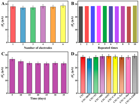The reproducibility of the proposed sensor was assessed by testing the ability of six parallel MIP/TiO2@Ti3C2Tx/GCEs to detect 0.4 µM of CTC under the same conditions. Their relative standard deviation (RSD) value was calculated to be only 2.26% (Figure 5A), indicating that the as-fabricated MIP/TiO2@Ti3C2Tx/GCE was highly reproducible for CTC sensing. The excellent repeatability of the MIP/TiO2@Ti3C2Tx/GCE sensor was also proved by employing one electrode for ten repeated detections of CTC, with an RSD of 0.71% (Figure 5B). Furthermore, the long-term stability of MIP/TiO2@Ti3C2Tx/GCE was evaluated based on its ability to detect CTC intermittently for five weeks using one electrode. This showed that the RSD of the seven detection results was only 5.1% (Figure 5C), revealing the satisfactory stability of MIP/TiO2@Ti3C2Tx/GCE.