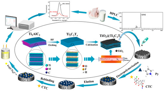 In view of the serious side effects of chlortetracycline (CTC) on the human body, it is particularly important to develop rapid, sensitive, and selective technologies for the detection of CTC in food. In this work, a molecularly imprinted electrochemical sensor with [Fe(CN)6]3−/4− as signal probe was proposed for the highly sensitive and selective detection of CTC. For this purpose, TiO2, which acts as an interlayer scaffold, was uniformly grown on the surface of Ti3C2Tx sheets through a simple two-step calcination process using Ti3C2Tx as the precursor to effectively avoid the stacking of Ti3C2Tx layers due to hydrogen bonding and van der Waals forces. This endowed TiO2@Ti3C2Tx with large specific surface, abundant functional sites, and rapid mass transfer. Then, polypyrrole molecularly imprinted polymers (MIPs) with outstanding electrical conductivity were modified on the surface of TiO2@Ti3C2Tx via simple electro-polymerization, where the pyrrole was employed as a polymeric monomer and the CTC provided a source of template molecules. This will not only provide specific recognition sites for CTC, but also facilitate electron transport on the electrode surface. The synergistic effects between TiO2@Ti3C2Tx and polypyrrole MIPs afforded the TiO2@Ti3C2Tx/MIP-based electrochemical sensor excellent detection properties toward CTC, including ultra-low limits of detection (LOD) (0.027 nM), a wide linear range (0.06–1000 nM), and outstanding stability, reproducibility, selectivity, and feasibility in real samples. The results indicate that this strategy is feasible and will broaden the horizon for highly sensitive and selective detection of CTC.