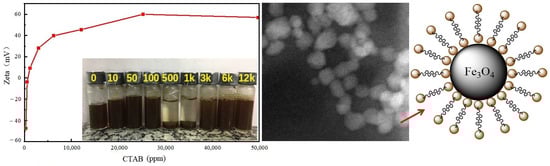 Pereira et al. [52] employed a co-precipitation method to prepare Fe3O4 nanoparticle suspension, followed by the addition of cetyltrimethylammonium bromide (CTAB) into the suspension and ultrasonic dispersion. At this stage, NPs interacted synergistically with CTAB, forming a stable nanofluid. Research indicates that as the CTAB dosage increases, the Zeta potential gradually increases. Initially, the nanofluid exhibits flocculation, followed by gradual stabilization. This phenomenon arises from the increased adsorption of CTAB on the surface of nanoscale Fe3O4, resulting in surface charge neutralization and particle aggregation. However, with a higher CTAB dosage, a bilayer adsorption phenomenon occurs on the surface of nanoscale particles, as shown in Figure 6, leading to the gradual stabilization of the nanofluid. This nanofluid effectively reduces the CA of water on calcite surfaces, achieving wettability alteration. Indoor oil displacement experiments have also demonstrated the significant enhancement in oil recovery rates facilitated by this nanofluid.