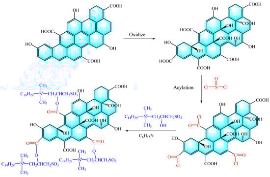 Radnia et al. [59] initiated the process by inducing carboxyl groups on the surface of graphene NPs through oxidation reactions. Following this, the carboxyl groups underwent a conversion into highly reactive acyl chloride groups through the use of thionyl chloride (SOCl2). Ultimately, with the involvement of N, N-dimethyl-n-butylamine (C6H15N), the acyl chloride groups engaged in a reaction with the hydroxyl groups located on the surfactant, leading to their grafting onto the graphene surface, as illustrated in Figure 9. The performance evaluation analysis revealed significant improvements attributed to the modified graphene oxide. It notably increased the CA of the rock surface to over 130°. Additionally, it effectively reduced the IFT by 11%. Most importantly, it resulted in a substantial boost in oil recovery by 16% and 19% in solutions containing 0.5 and 2 mg/L of the modified graphene oxide, respectively. These findings underscore the potential of the modified graphene oxide in enhancing oil recovery processes.