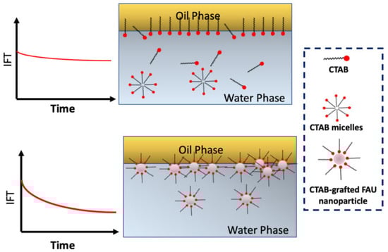 Schematic presentation of IFT profiles upon applying elevated concentrations of virgin CTAB solution and low concentration of CTAB-grafted FAU NPs [68].