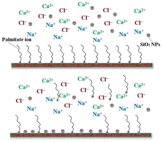 Currently, the formation of a nanoscale monolayer film by NPs on rock surfaces has been proven to modify rock surface wettability and permeability [71]. In the context of nanofluid EOR processes, it is essential to decrease the adhesive forces between rock surfaces and oil droplets. The formation of a thin nanofilm between the oil reservoir and rock formations plays a crucial role in enhancing the reservoir’s hydrophilic properties, ultimately leading to improved wettability of the formation. This, in turn, facilitates smoother oil flow within the reservoir. Tetteh et al. [72] verified this through numerical simulations and EOR experiments, demonstrating that hydrophilic NPs can adsorb to pore wall surfaces, causing wettability alteration. Silica-based NPs are predominantly used for this purpose. Hou et al. [73] also corroborated this, indicating that Na+ ions in formation water, in close proximity to solid surfaces, neutralize some of the negative charges on carbonate rock surfaces. This increased adsorption of nanoscale SiO2 particles on solid surfaces replaces the oil layers(palmitate ion) previously adsorbed, resulting in a wettability reversal from oil-wet to hydrophilic surfaces on carbonate rocks (Figure 12).