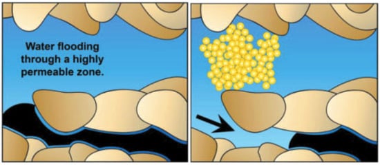 NPs adhere to each other and to oil reservoir rocks through physical or chemical interactions, leading to their retention within the pores [79]. This phenomenon brings about a significant alteration in the oil reservoir’s permeability and facilitates the bridging and sealing of larger pores, as illustrated in Figure 14. Consequently, the continuous injection of nanofluids increases pressure, propelling the fluid towards smaller pores and expanding the conformance efficiency [80,81]. The sweep coefficient is directly related to the oil displacement efficiency [82]: