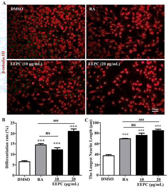 Effect of EEPC on the differentiation of Neuro-2a cells. (A) Neuro-2a cells were treated with EEPC at different concentrations from 1 to 20 μg/mL for 48 h. RA, retinoic acid, as a positive control. Scale bar, 50 mm. The differentiation rate (B) and the longest neurite length (C) of each differentiated cell were calculated. One-way ANOVA followed by Tukey’s test. Error bars represent SEM (n = 3). *** p < 0.001, EEPC and RA vs. DMSO; ### p < 0.001, EEPC vs. RA; ns, no significant differences.