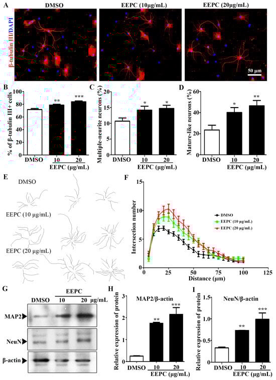 We observed that the ratio of β-tubulin III positive cells (Neurons) was significantly increased from 71.6 ± 1.8% (DMSO) to 75.9 ± 1.3% (EEPC, 10 μg/mL) and 83.9 ± 1.3% (EEPC, 20 μg/mL), respectively (Figure 3A,B). This result suggested that EEPC could promote NSPC differentiation into neurons. Neuronal differentiation is a sequential, multi-step process in which cells change from progenitor cells to premature neurons and finally into mature neurons. During neuronal development, cell morphology undergoes dramatic changes, in which the neurite extension and the number of branches per neuron increase. To gain further insight into the effects of EEPC on neuronal maturation, the proportion of multi-neurite neurons (more than two branches) were measured. The results showed that the percentage of multi-neurite neurons was significantly increased from 10.68 ± 1.0% (DMSO) to 14.2 ± 1.2% (EEPC, 10 μg/mL) and 14.7 ± 1.0% (EEPC, 20 μg/mL), respectively (Figure 3C). Mature-like neurons had more and longer dendrites. It is worth noting that EEPC treatment significantly increased the percentage of mature-like neurons from 23.6 ± 4.5% (DMSO) to 40.2 ± 4.7% (EEPC, 10 μg/mL) and 46.5 ± 5.1% (EEPC, 20 μg/mL), respectively. Finally, the effect of EEPC on dentritic complexity was assessed by Sholl analysis (Figure 3E,F). Furthermore, the expression levels of neuronal markers (MAP2 and NeuN) were determined by Western blot (Figure 3G). Consistent with the results of immunofluorescence staining, the expression of MAP2 and NeuN was upregulated in EEPC-treated cells (Figure 3H,J). These results suggest that EEPC can promote the morphological maturation of newborn neurons.