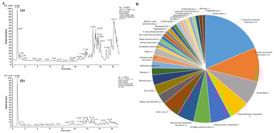 UHPLC-Q-Exactive-MS/MS analysis of the chemical constituents in the EEPC. (A) Positive ion mode (a) and Negative ion mode (b). (B) Classification of chemical constituents.